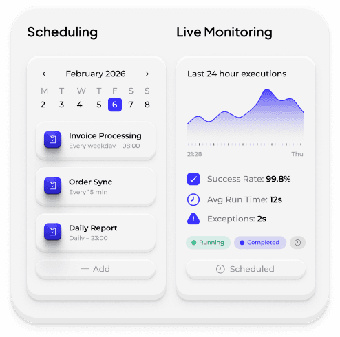 A unified workspace to build, schedule, monitor, and orchestrate your automations with full operational control.