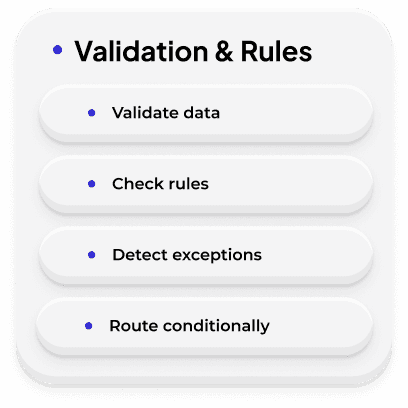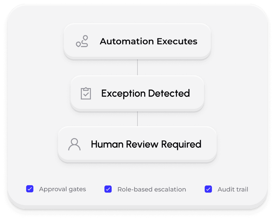 The platform includes built-in monitoring, exception handling, audit logs, and role-based access controls. Automations are continuously tracked, and issues escalate with context to the right people — ensuring stability at scale.