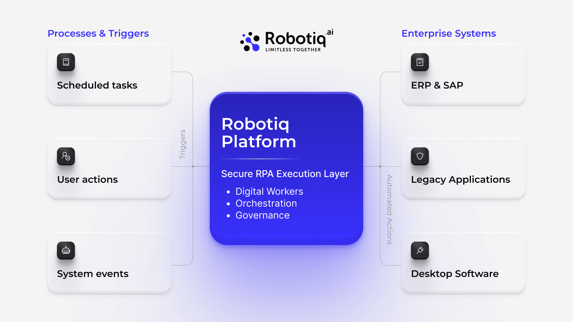 Yes. Robotiq is designed to work across legacy systems, desktop applications, ERP platforms, and modern APIs. It operates within your real environment without requiring system replacement or heavy custom development.