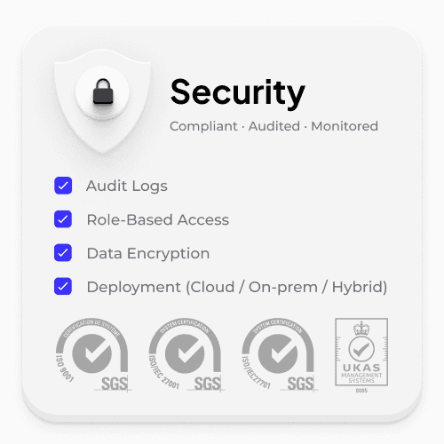 Built with ISO-certified security, audit logs, and flexible deployment options for risk-aware enterprises.
