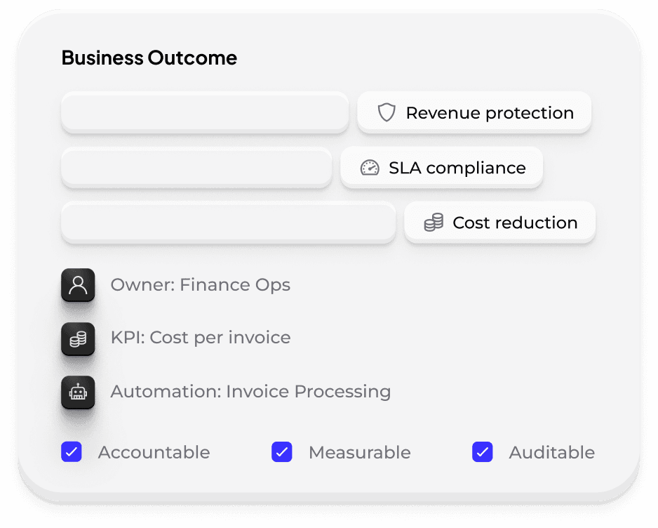 Automation outcomes mapped to business owners, KPIs, and accountability.